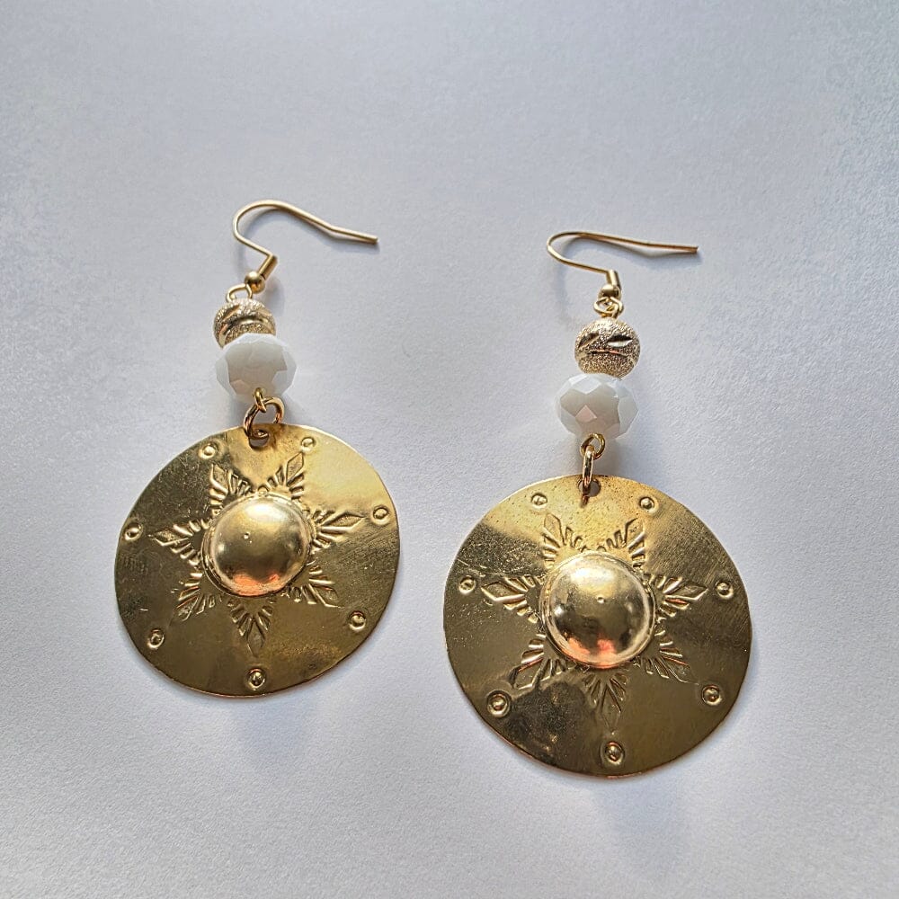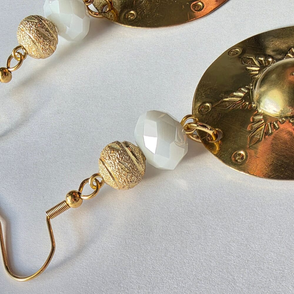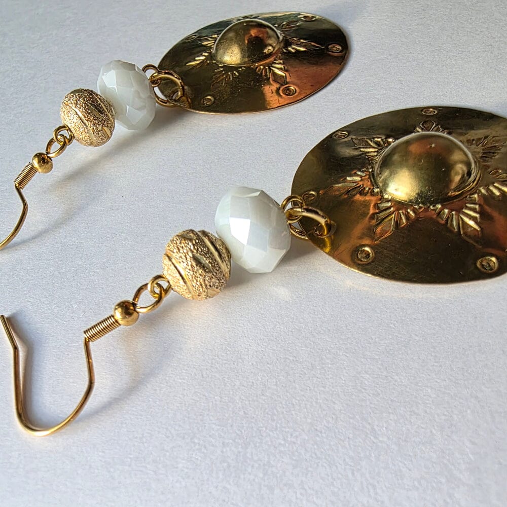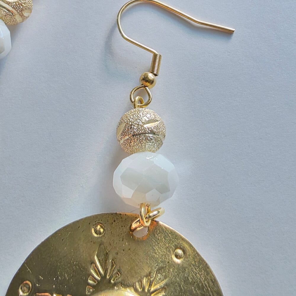 The gold bead features granulation style and etching design that crowns a white faceted glass crystal and brass agong. Ear wire hooks are gold-plated stainless steel for a comfortable wear, along with gold-plated brass findings.